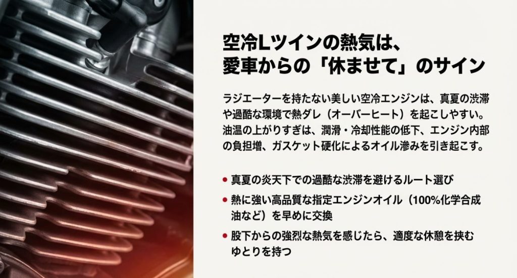 A. 真夏の炎天下での過酷な渋滞走行をなるべく避けることが基本です。また、熱に強い高品質な指定エンジンオイル(100%化学合成油など)を使用し、早め早めに交換することが重要です。股下から強烈な熱気を感じたら、適度な休憩を挟むゆとりを持ったライディングを心がけましょう。