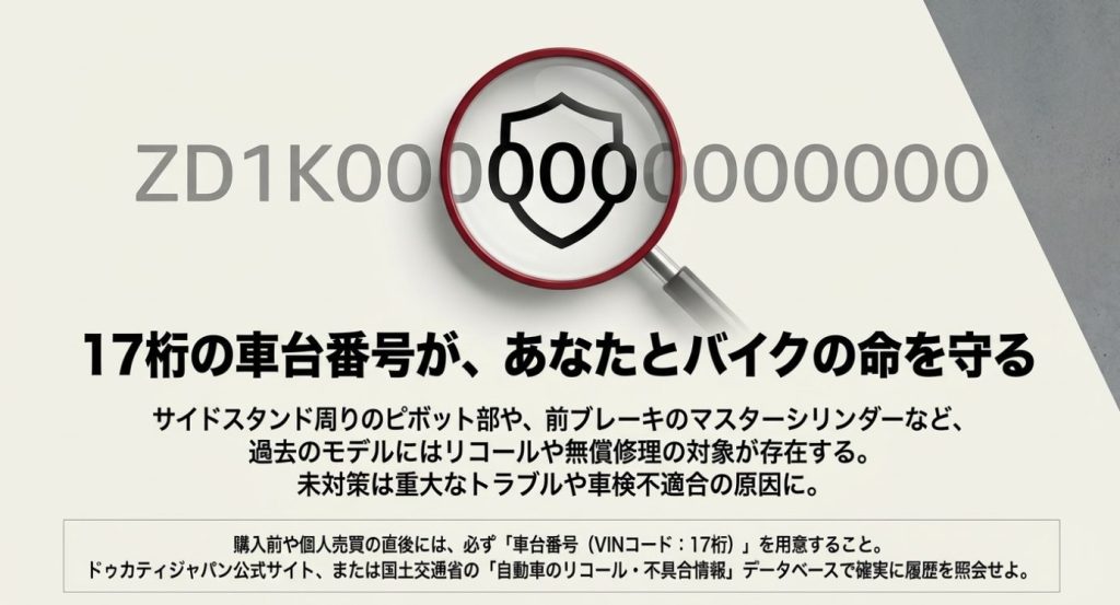 確認手順としては、お手元の車両の車台番号(VINコード:17桁の英数字)を用意し、ドゥカティジャパンの公式サイト内にあるリコール検索ページに入力するのが最も確実で早いです。